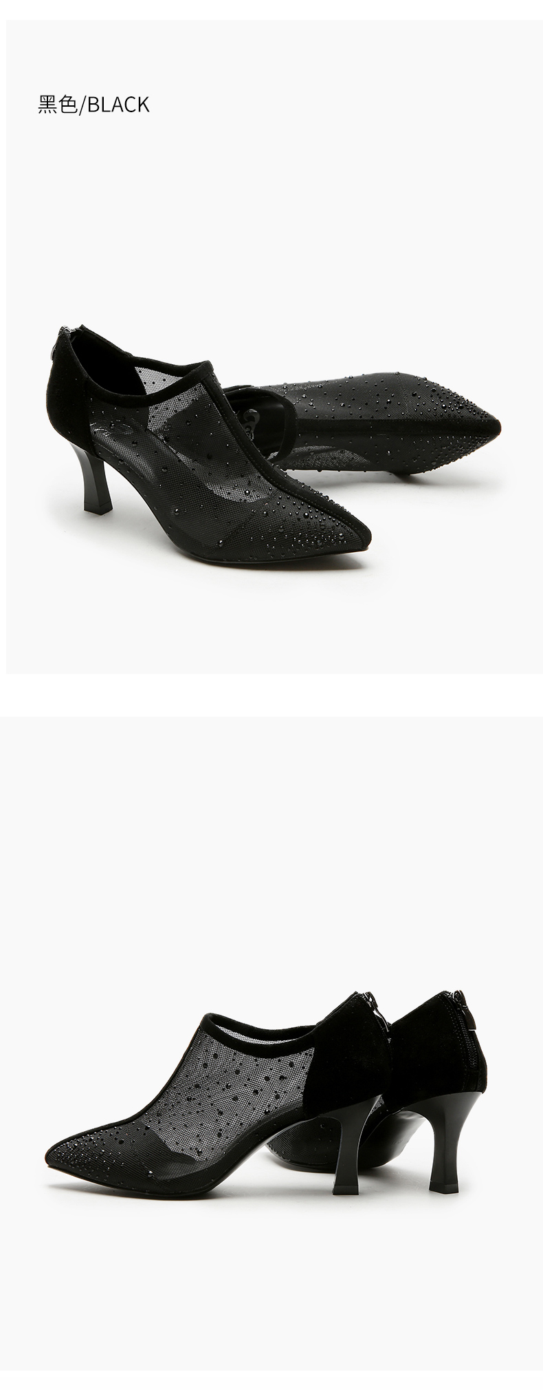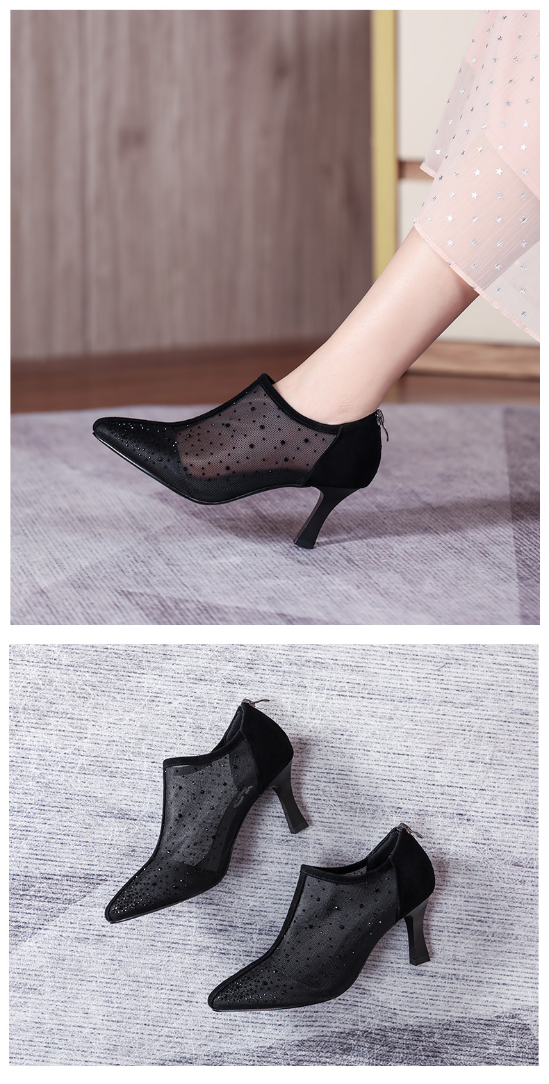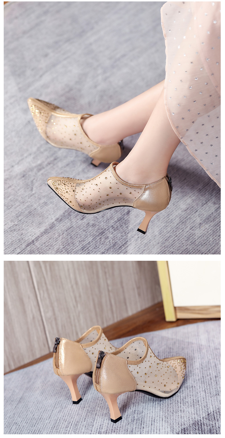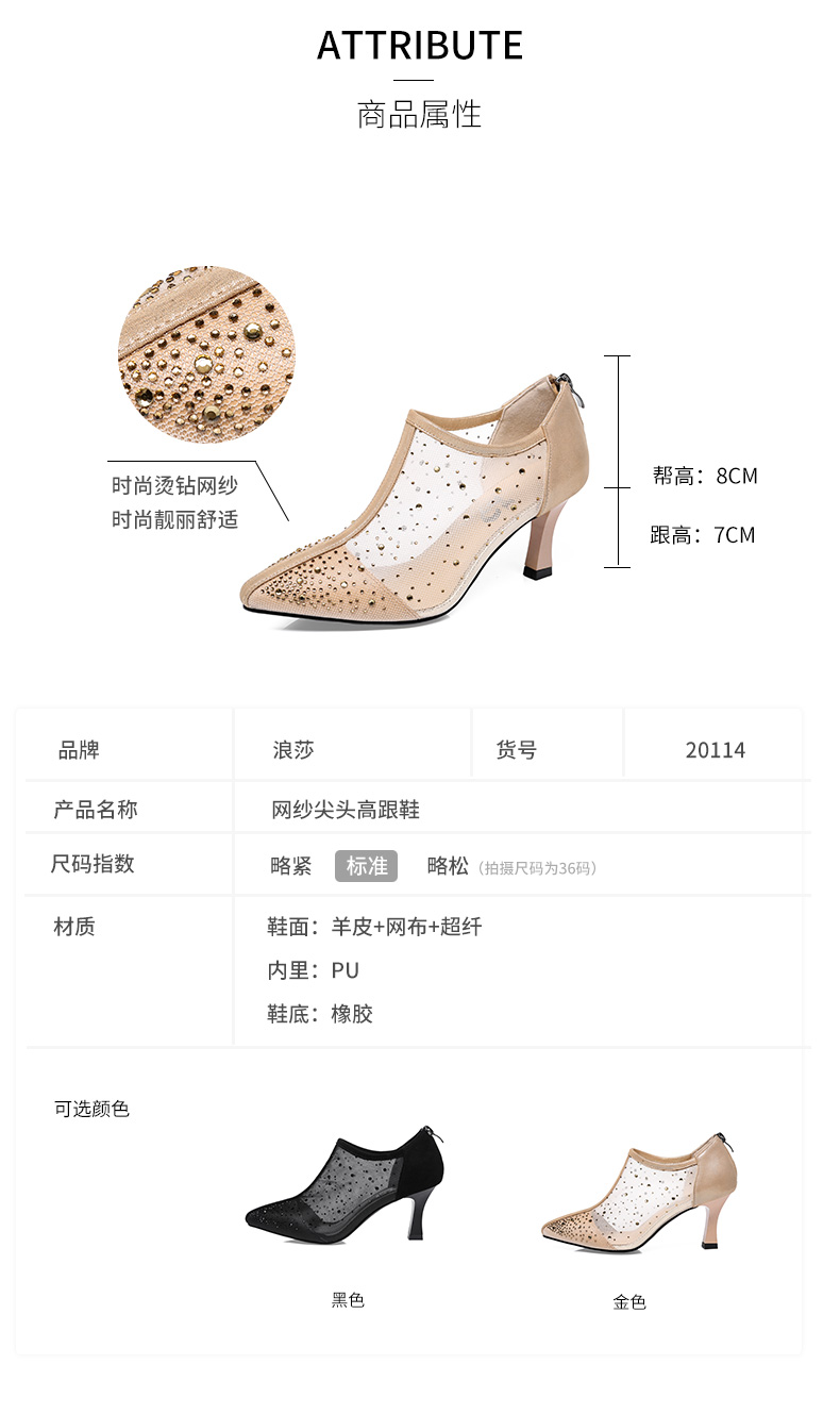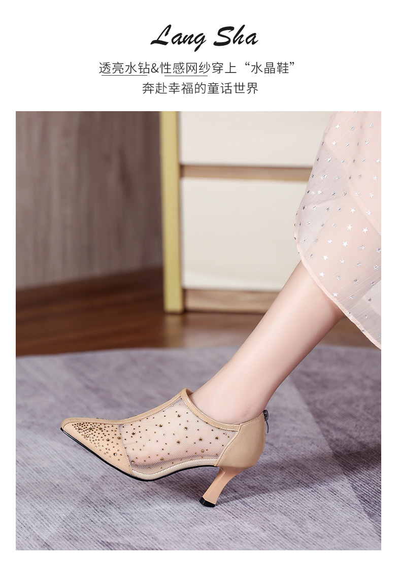 浪莎法式尖頭高跟鞋女細(xì)跟2021春夏新款深口鏤空網(wǎng)紗水鉆休閑單鞋