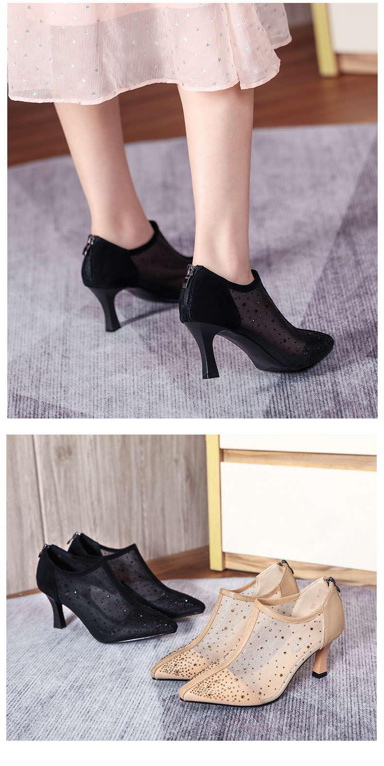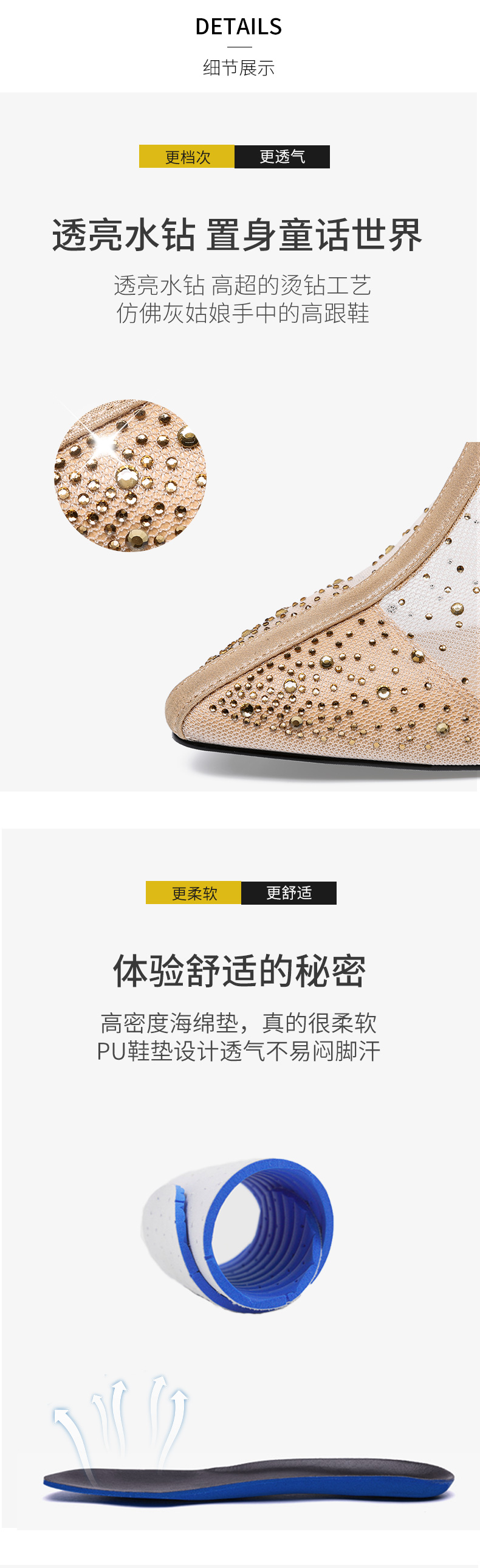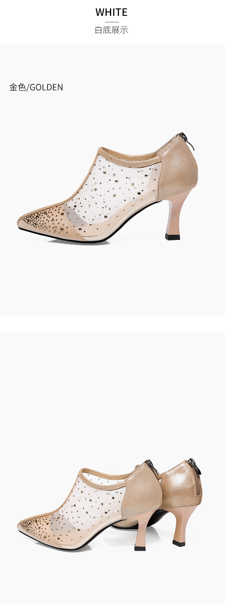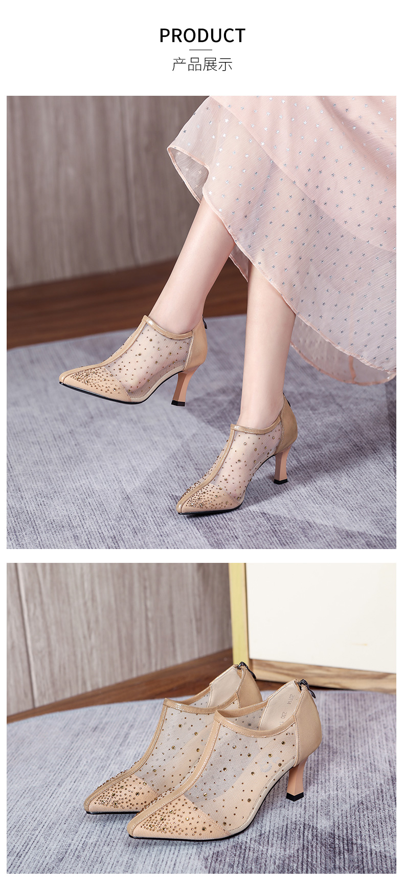浪莎法式尖頭高跟鞋女細(xì)跟2021春夏新款深口鏤空網(wǎng)紗水鉆休閑單鞋